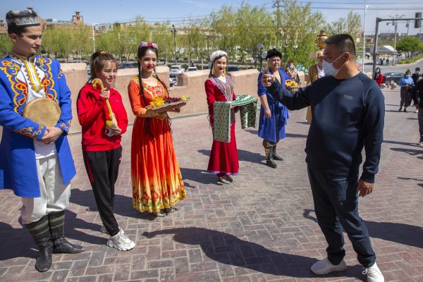 A tourist snaps pictures of Uyghur performers at the front gate of the remodeled city center of Kashgar in Xinjiang, April 19, 2021. Credit: AP Photo/Mark Schiefelbein