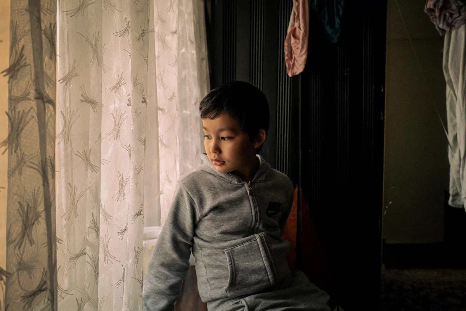 Lütfullah Kuçar, 8, waits at home for his sister, Aysu Kuçar, to return from school, in Istanbul. The two Uyghur children were forcibly separated from their family and spent nearly 20 months in state boarding schools in Xinjiang, China. Nicole Tung for NPR