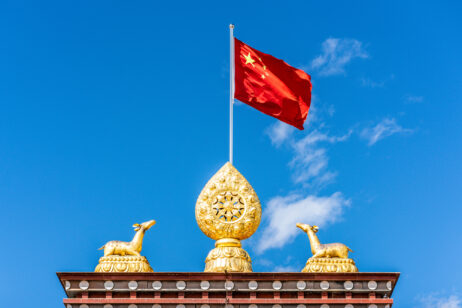 A dharma wheel and Chinese flag at Ganden Sumtsenling Tibetan Buddhist monastery, Shangri-La, China.