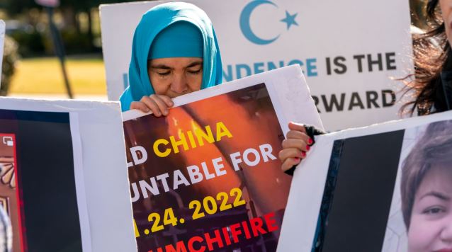 Fotoğraf: Aşigül Noşirvan, 28 Kasım 2022 Pazartesi günü Çin'de meydana gelen Urumçi yangın felaketinin ardından Washington'daki Dışişleri Bakanlığı önünde düzenlenen bir protestoda Çin'i protesto ediyor ve Uygur halkına desteğini ifade ediyor. (AP Fotoğrafı / Jacquelyn Martin)