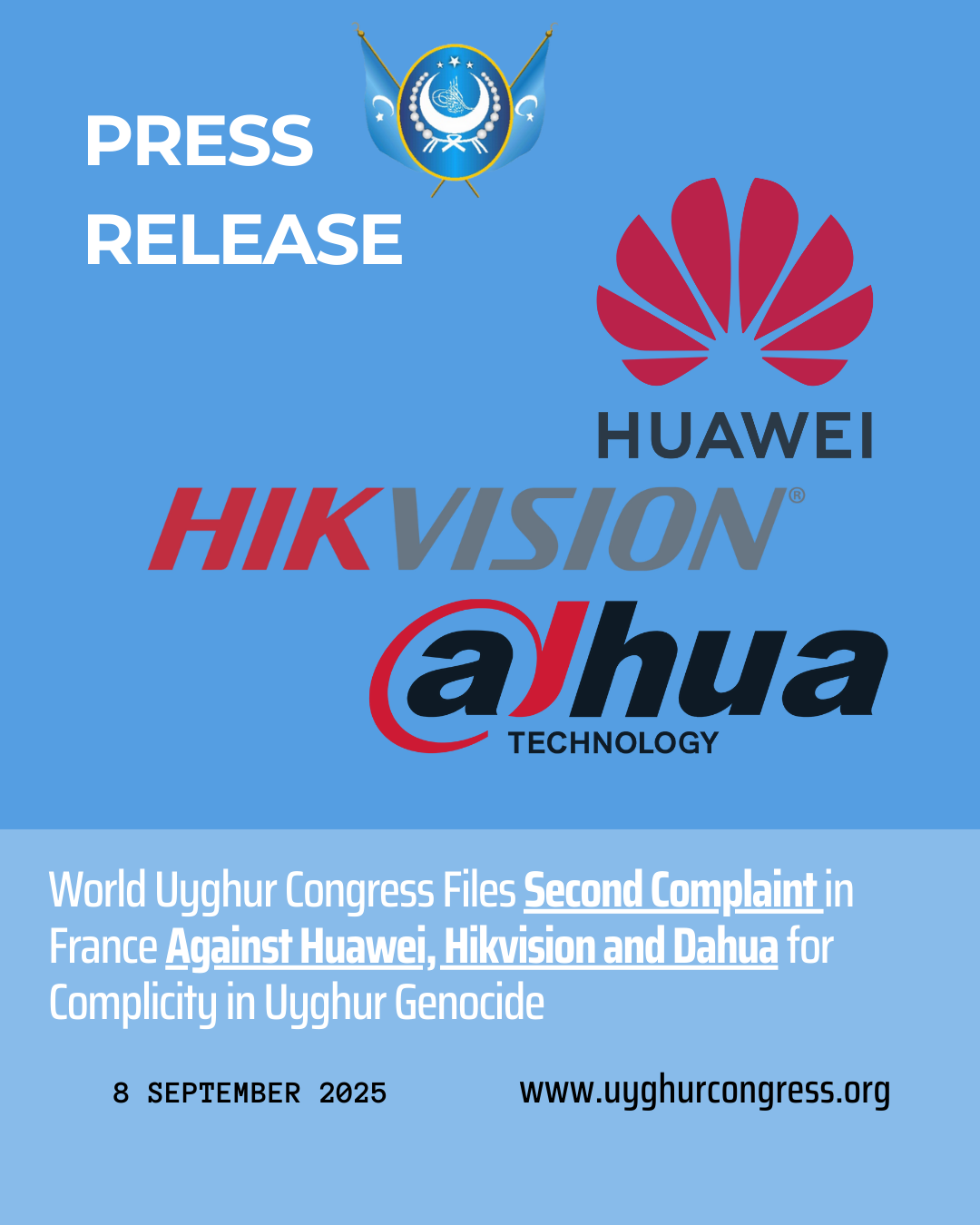 Turkistan Times, 13 Eylül 2025 - Dünya Uygur Kongresi (WUC), Çinli teknoloji devleri Huawei, Hikvision ve Dahua’ya karşı Fransa’da ikinci kez suç duyurusunda bulundu. Paris Savcılığı’na sunulan başvuruda, söz konusu şirketler, Çin Komünist Partisi’nin Doğu Turkistan’da kurduğu gözetim ve baskı sistemine doğrudan katkıda bulunmakla suçlanıyor.