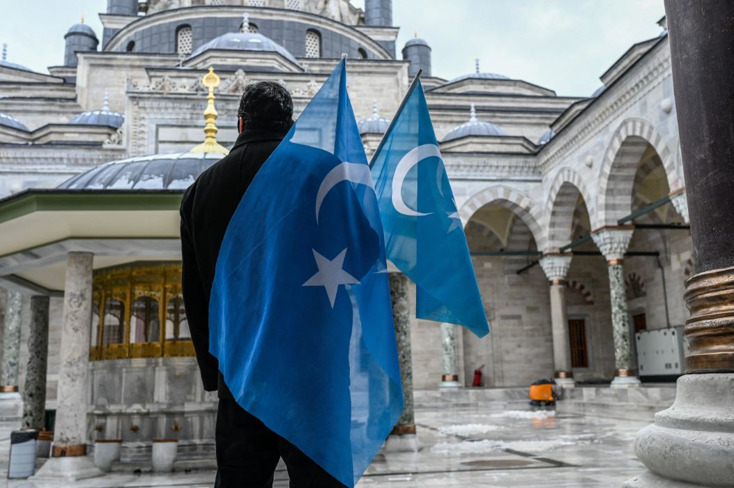 Türkiye’de yaşayan Uygur topluluğundan bir protestocu, Çin’in dışişleri bakanının Türkiye ziyaretini protesto etmek için 25 Mart 2021’de İstanbul’daki Beyazıt Camisi’nde Doğu Türkistan bayraklarıyla ayakta duruyor. © 2021 BULENT KILIC/AFP via Getty Images